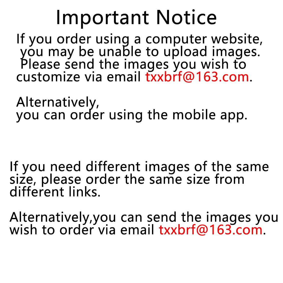 If you order using a computer website you may be unable to upload images. Please send the images you wish to customize via email txxbrf@163.com